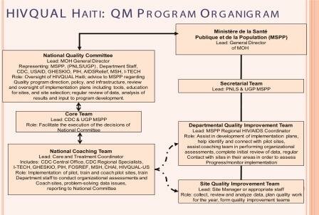 The National Quality Committee - which developed and defined indicators, chose participating facilities and developed an organizational system to support these activities – maintains oversight of the national program. The Committee and HQ-Haiti have confirmed an operational plan for coaching and mentoring which includes 2 coaching visits per year, an annual organizational assessment, and regular communication with facilities to support and collect QI project information.